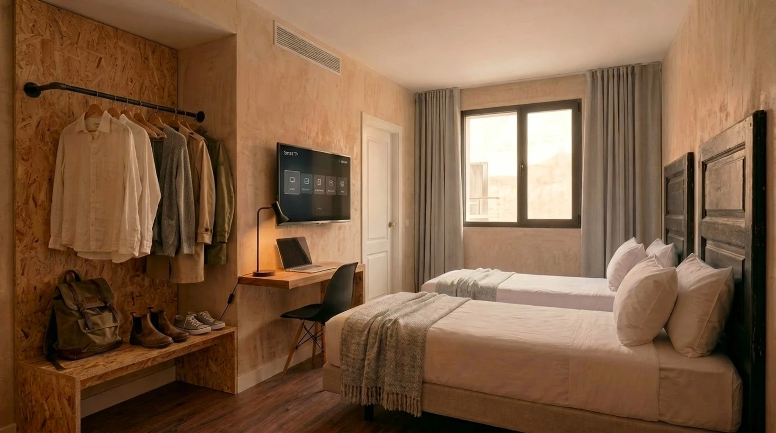 Camas con colchones Pikolin nuevos, aire acondicionado por conductos, insonorización mejorada y acceso con tarjeta.